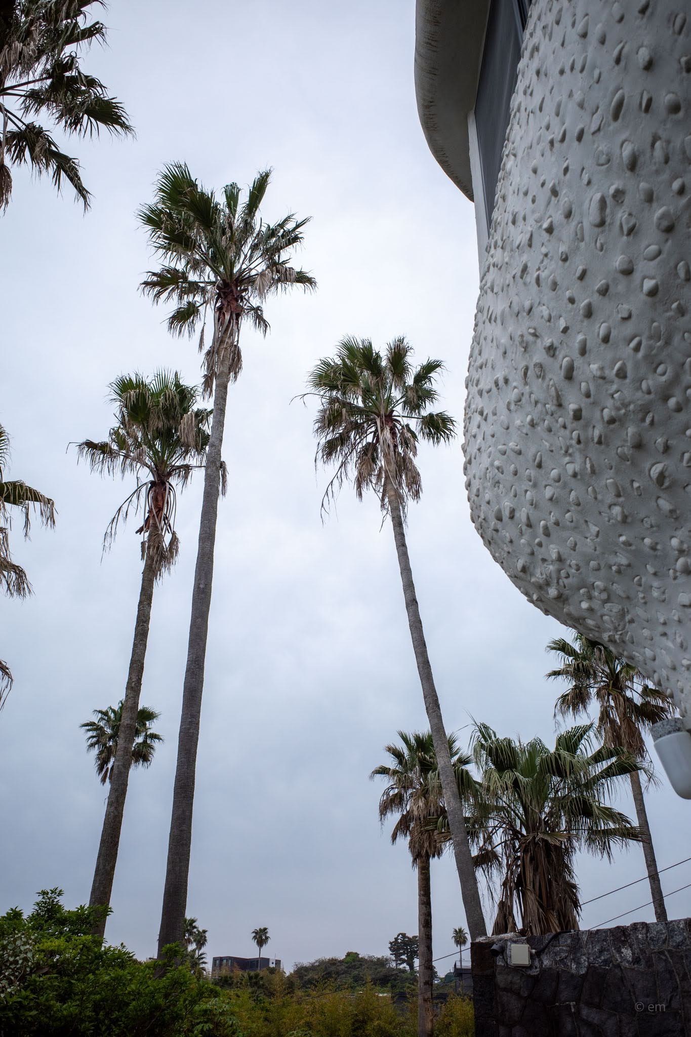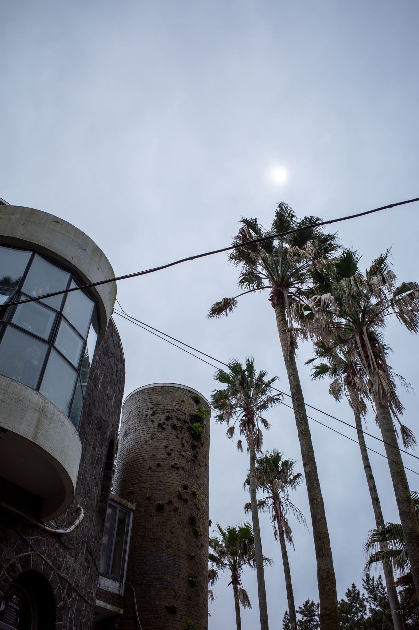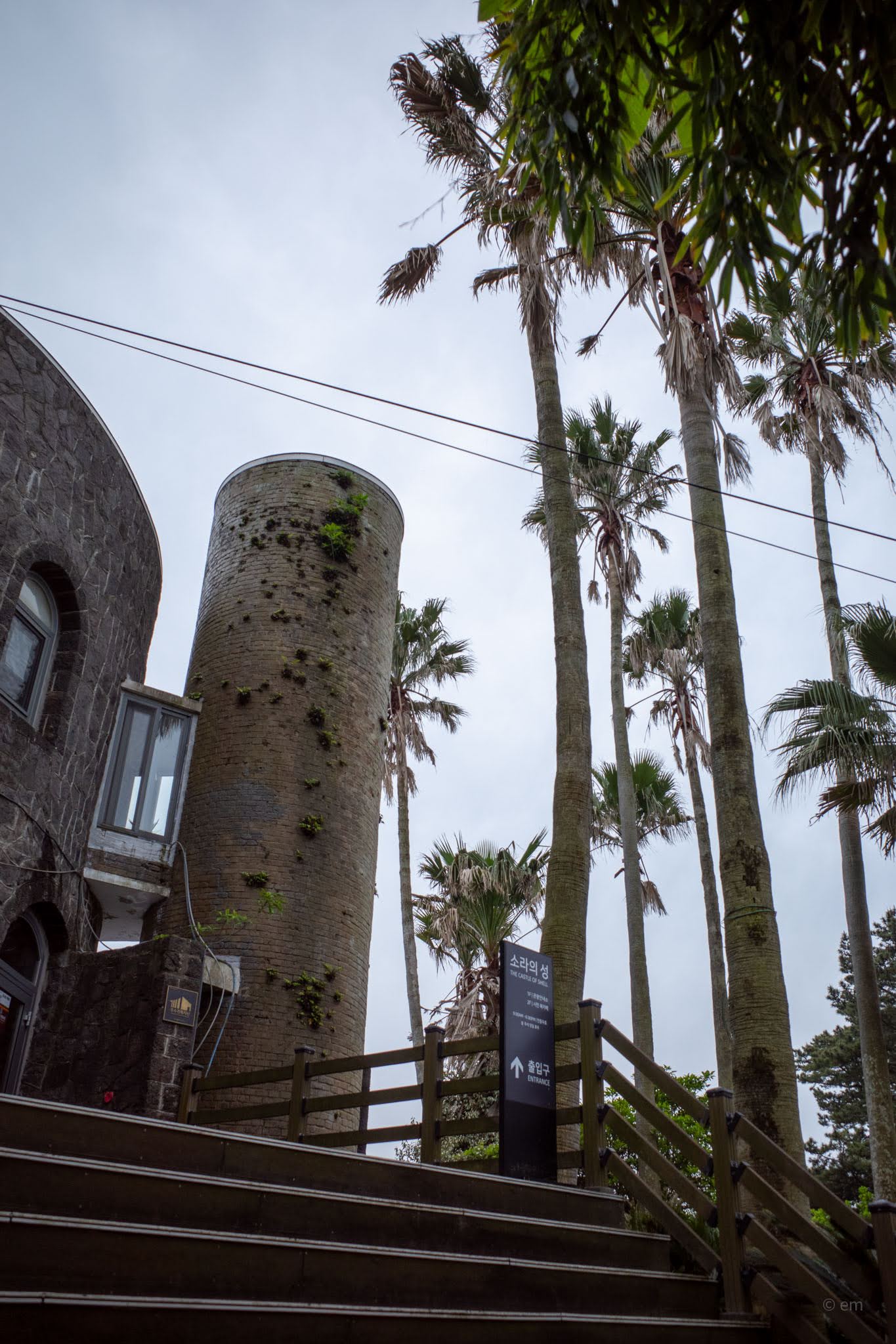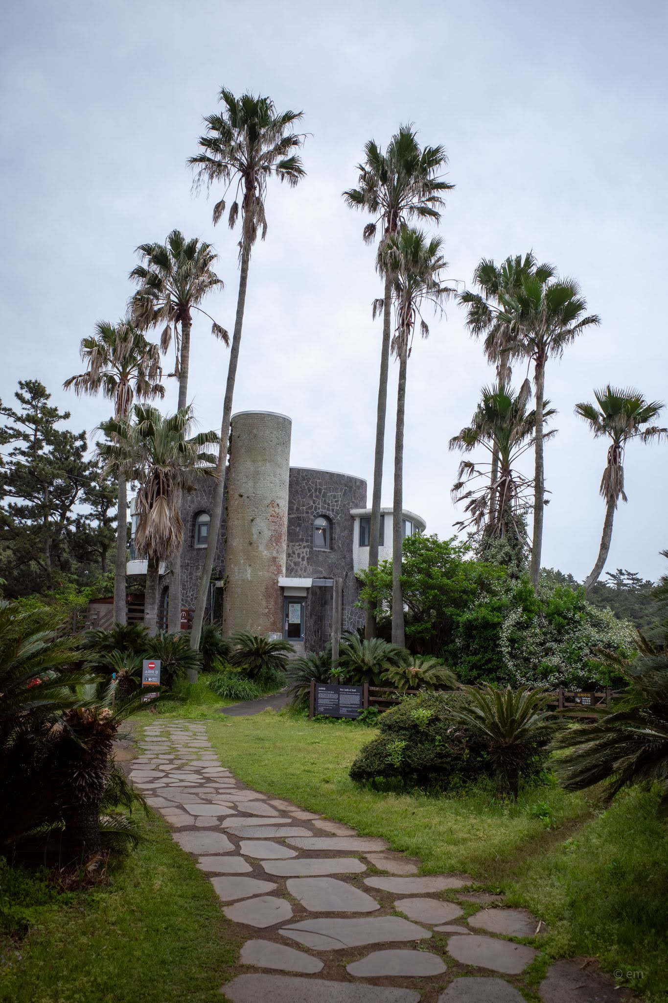 The complex is actually two buildings that read, from a distance, as one — which is part of the disorientation of arriving here for the first time. The dark structure that dominates the approach path is built from cut basalt in the mosaic-like pattern characteristic of older Jeju construction: dark, angular, castle-like, with arched windows punched into the stone and a tall cylindrical tower that sprouts vegetation from its mortar joints. Approaching along the stepping-stone path through the palms, it reads like something from a different latitude entirely — a Moroccan watchtower, a Canary Islands ruin, anything but a 1960s Jeju building.