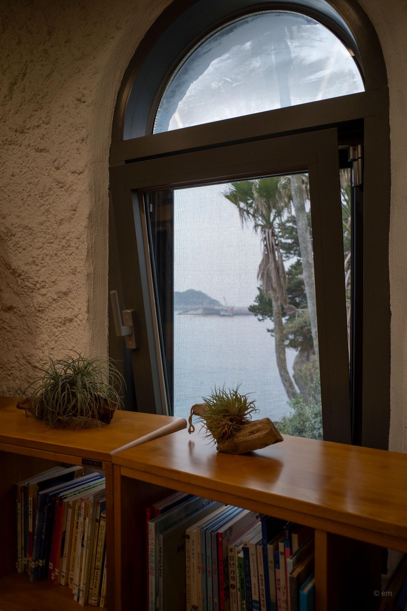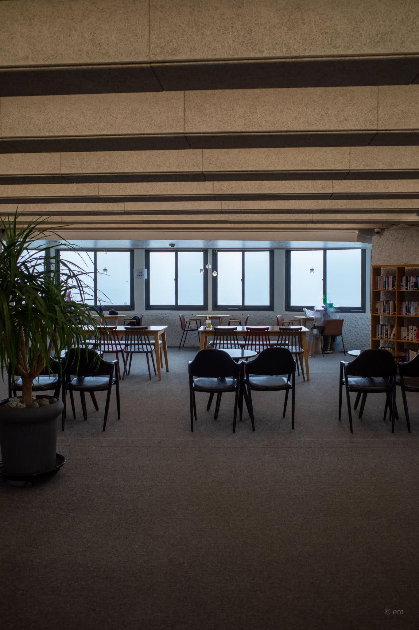 The room is quiet in the way that rooms with good acoustics are quiet. People read. The sea sits in the window. No drinks are served — it is simply a free public space run by Seogwipo City, a designation that seems both bureaucratically ordinary and genuinely radical for somewhere this beautiful.