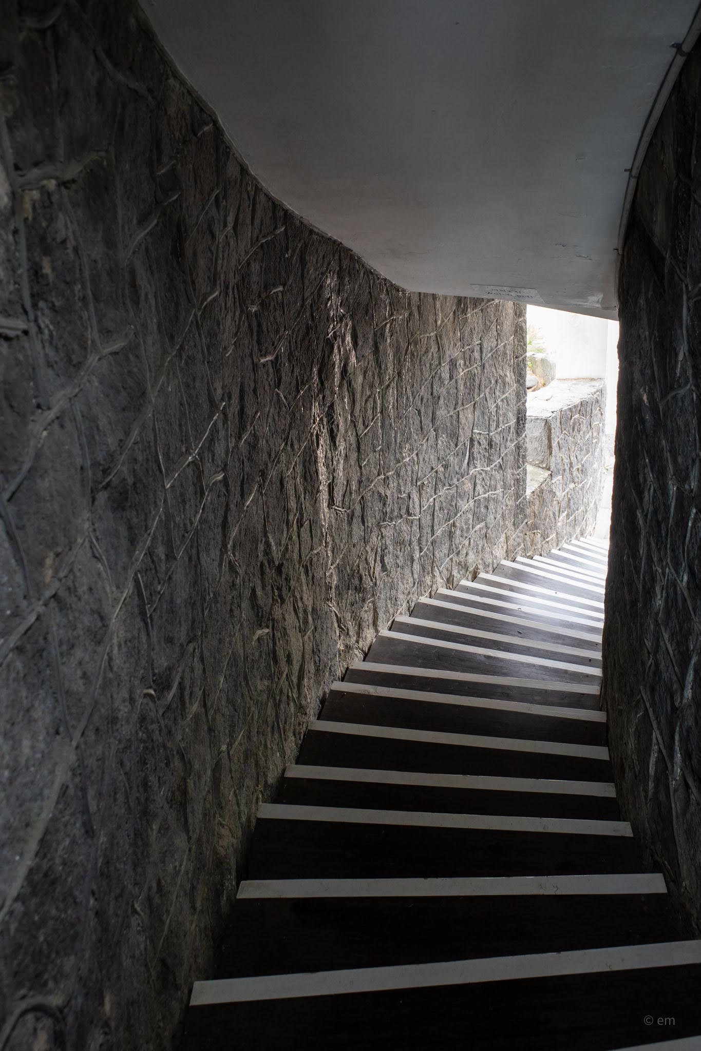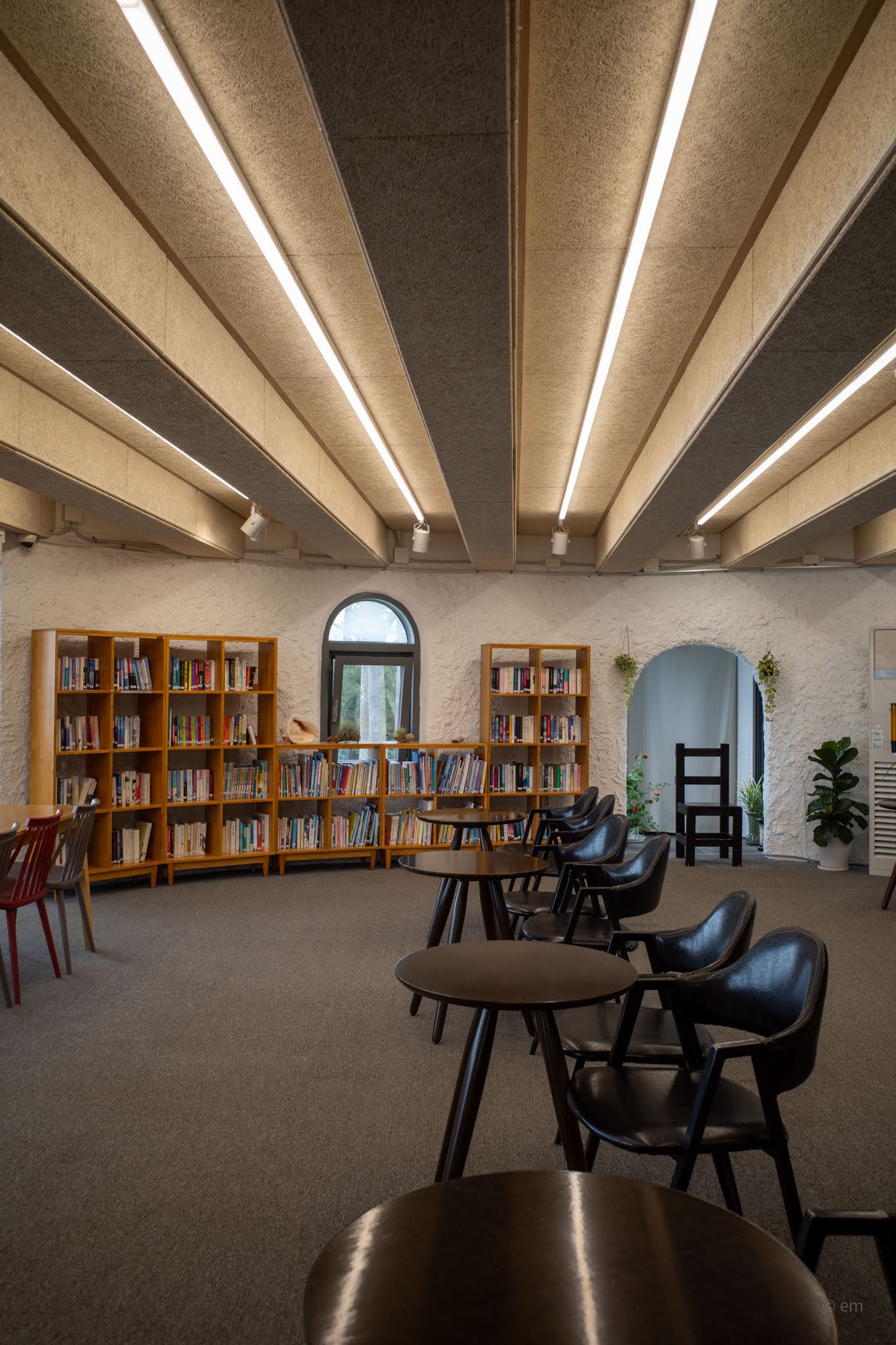 The ground floor is tourist information. The book café occupies the upper level, reached via a narrow staircase channeled through the basalt walls — dark treads, white nosings, volcanic stone pressing in on both sides. The corridor climbs through near-blackness and emerges into something completely unexpected: a carpeted reading room with a ribbed, coffered ceiling lit by long fluorescent strips running like organ pipes toward the windows. Oak bookshelves line the walls. Black leather chairs cluster at low round tables. An arched window — the kind that belongs in a Romanesque chapel — frames a palm trunk and, beyond it, the flat grey of the South Sea.