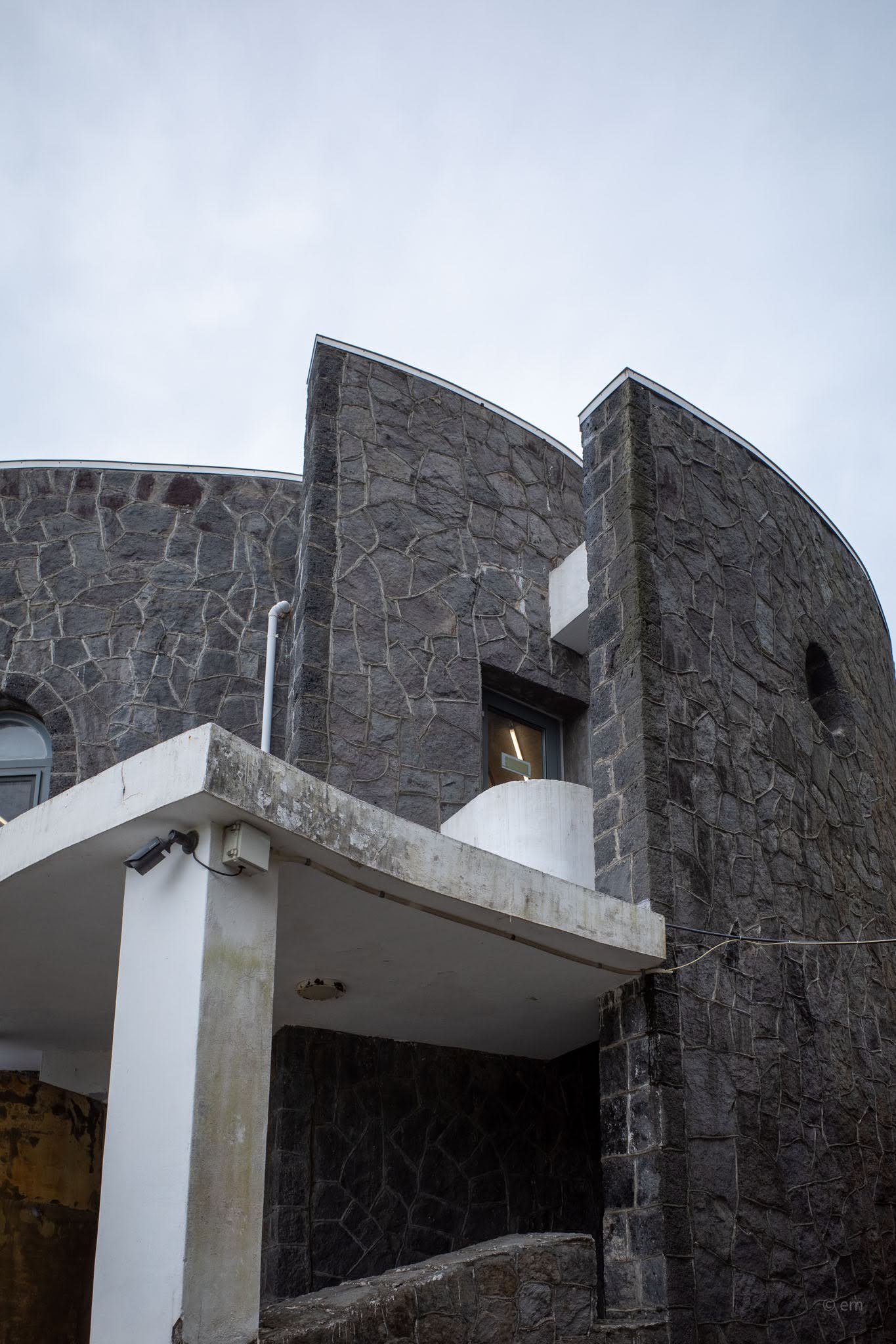 In the late 1960s, a building appeared on the cliff above Sojeongbang waterfall that nobody has been able to fully explain. No original drawings survive. No contracts, no client records, no commission papers. What remains is the object itself — two cylindrical forms in rough-cut basalt stone, one wide and low, one tall and narrow, connected by curving passages and arched openings, the whole composition spiraling faintly like something pulled from the sea.