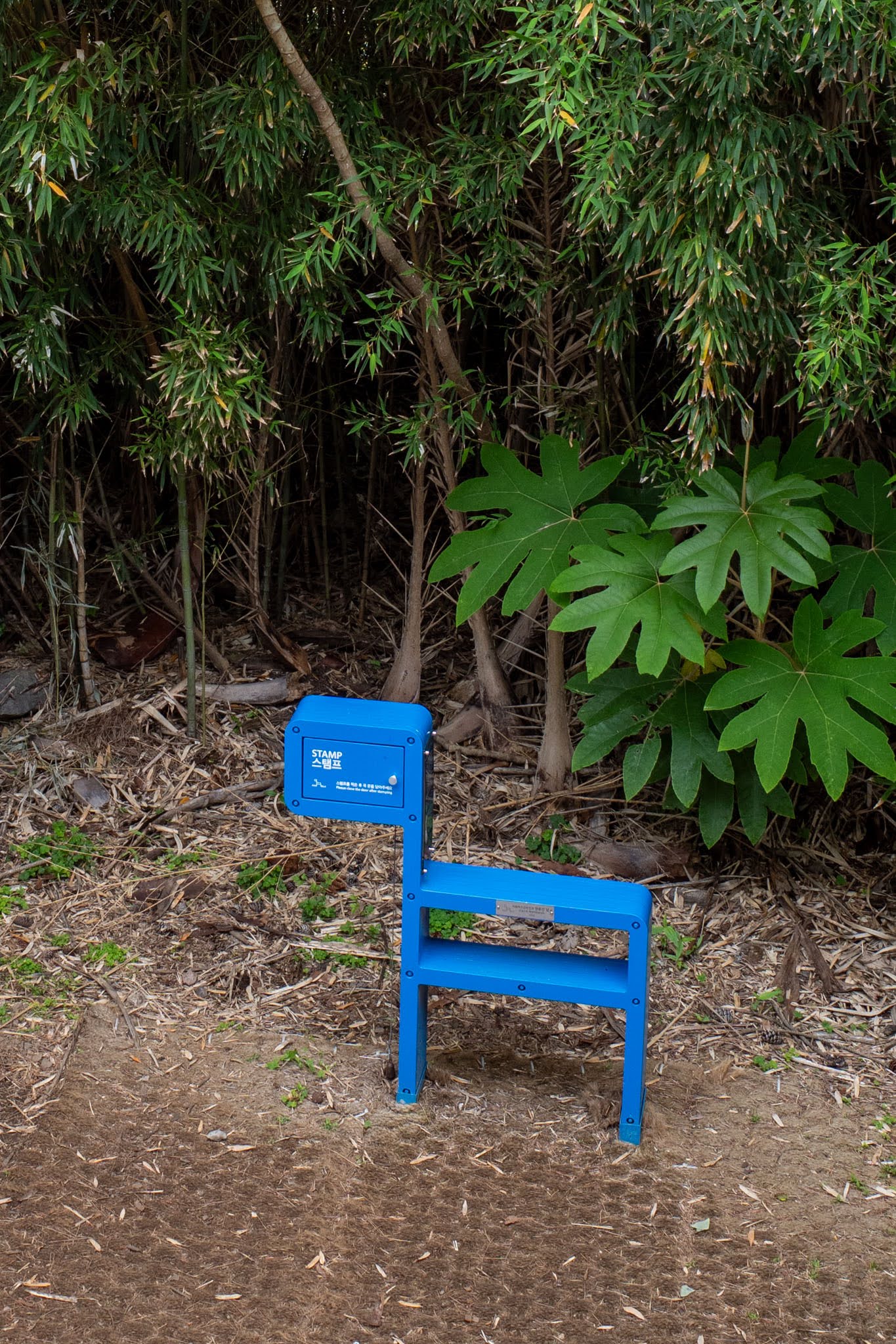 Sojeongbang waterfall is minutes away on foot, down a path through bamboo. A palm tree grows directly from the rock face at the waterfall’s edge — a detail so cinematically placed it looks like set dressing — and the water falls in a wide arc onto the basalt below, free to enter. The blue stamp station in the bamboo grove nearby marks this as Jeju Olle Route 6 territory: a long, mostly coastal walk that is broadly considered the most beautiful of the Olle routes, with 소라의 성 at its visual apex.