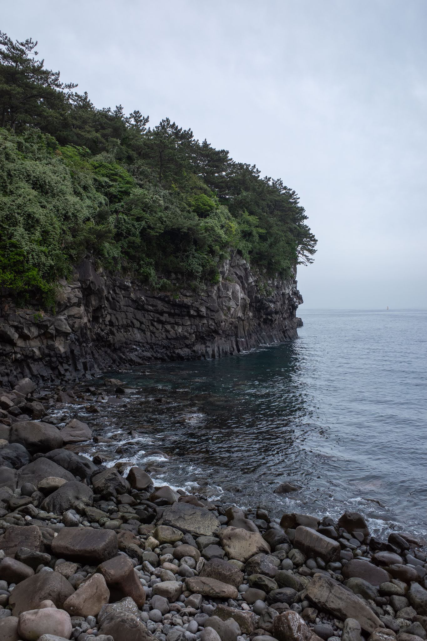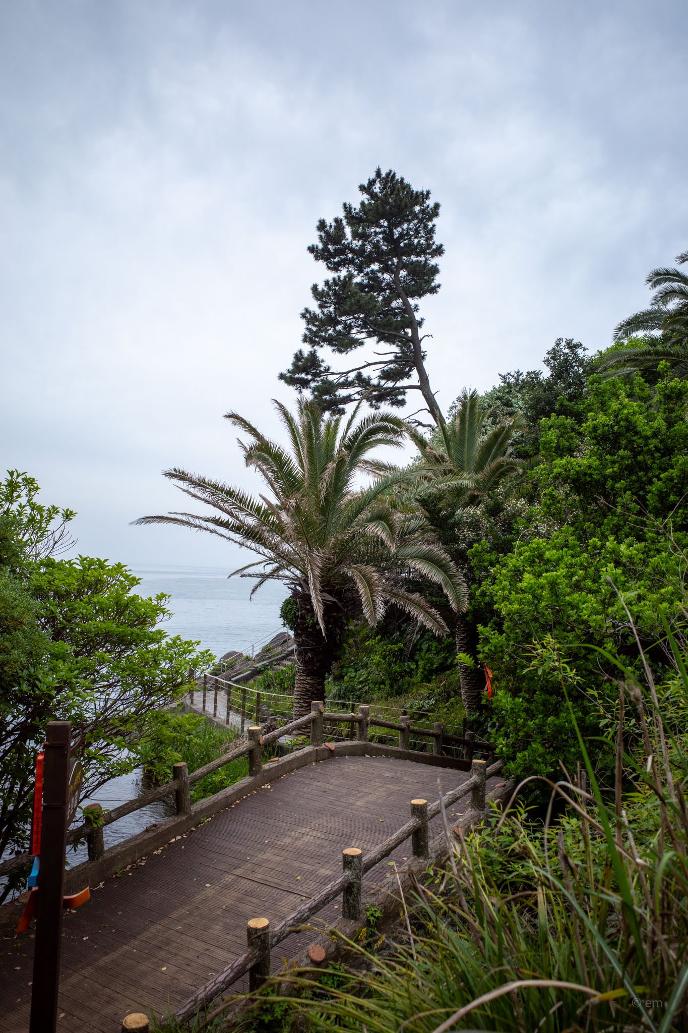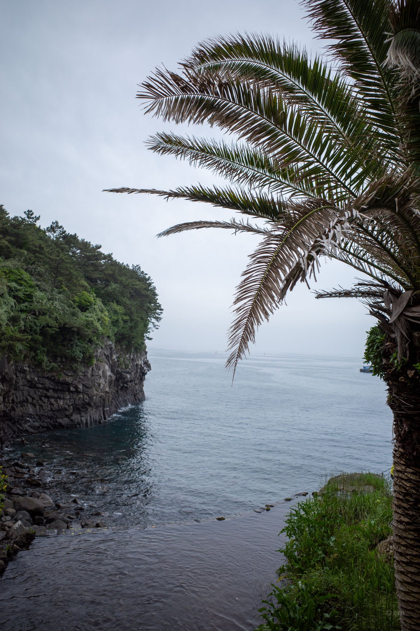 The path down from the castle to the water is worth taking slowly. A wooden boardwalk descends through subtropical greenery — fan palms, cycads, fig, and wild grasses tumbling toward the cliff edge — to a basalt boulder beach where the columns of Jeju’s volcanic shoreline meet the water in layers. Looking back up from the rocks, the scale of the cliff and the improbability of the building’s position above it becomes fully apparent.