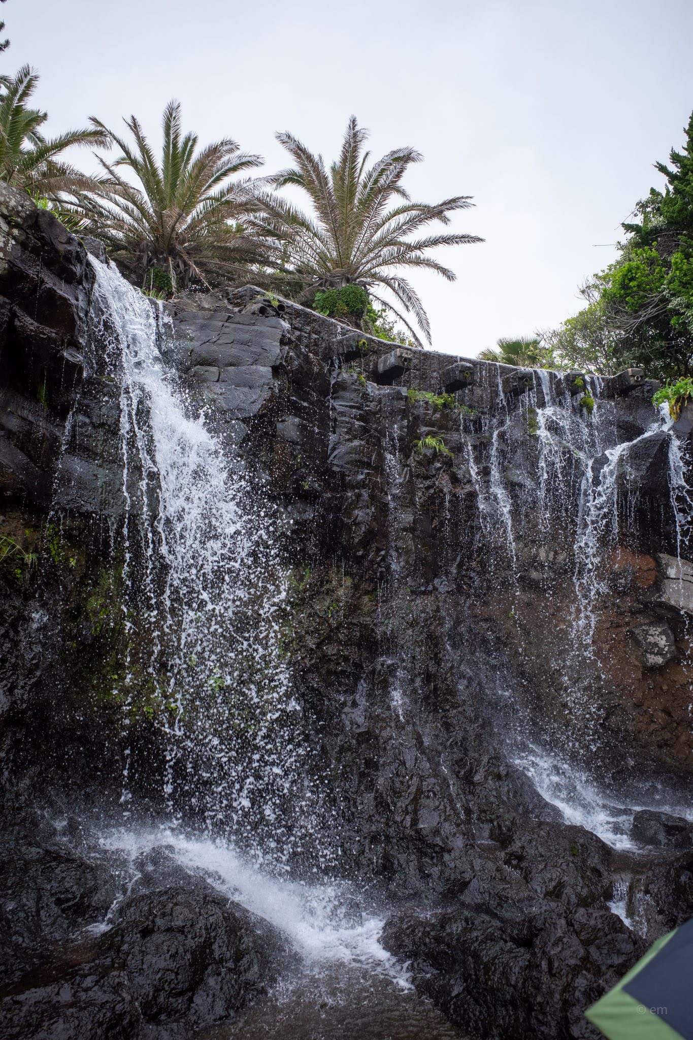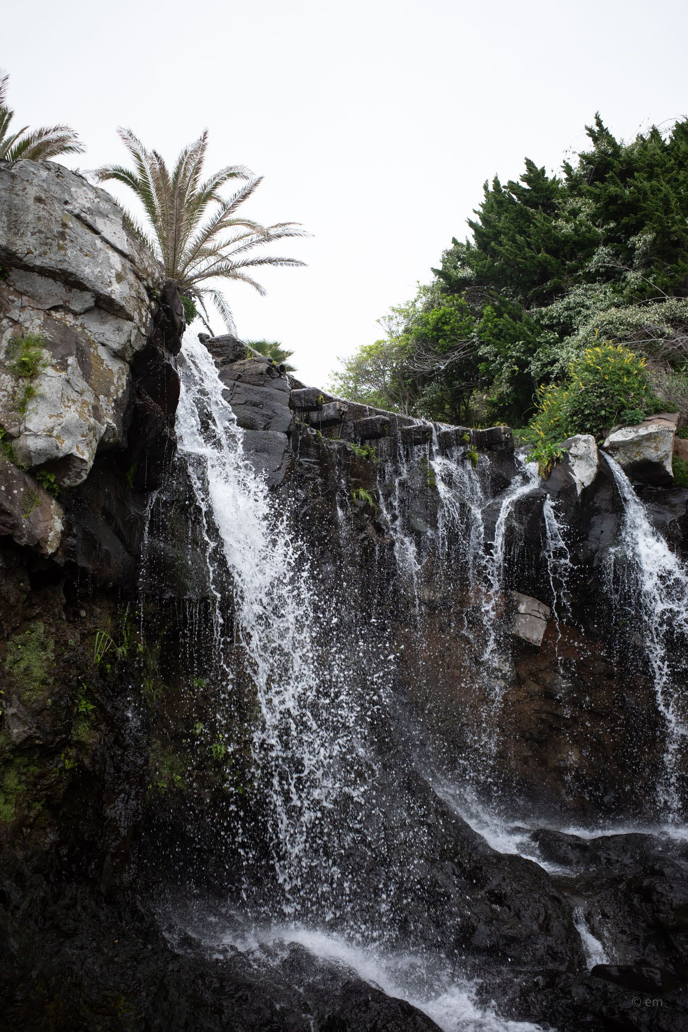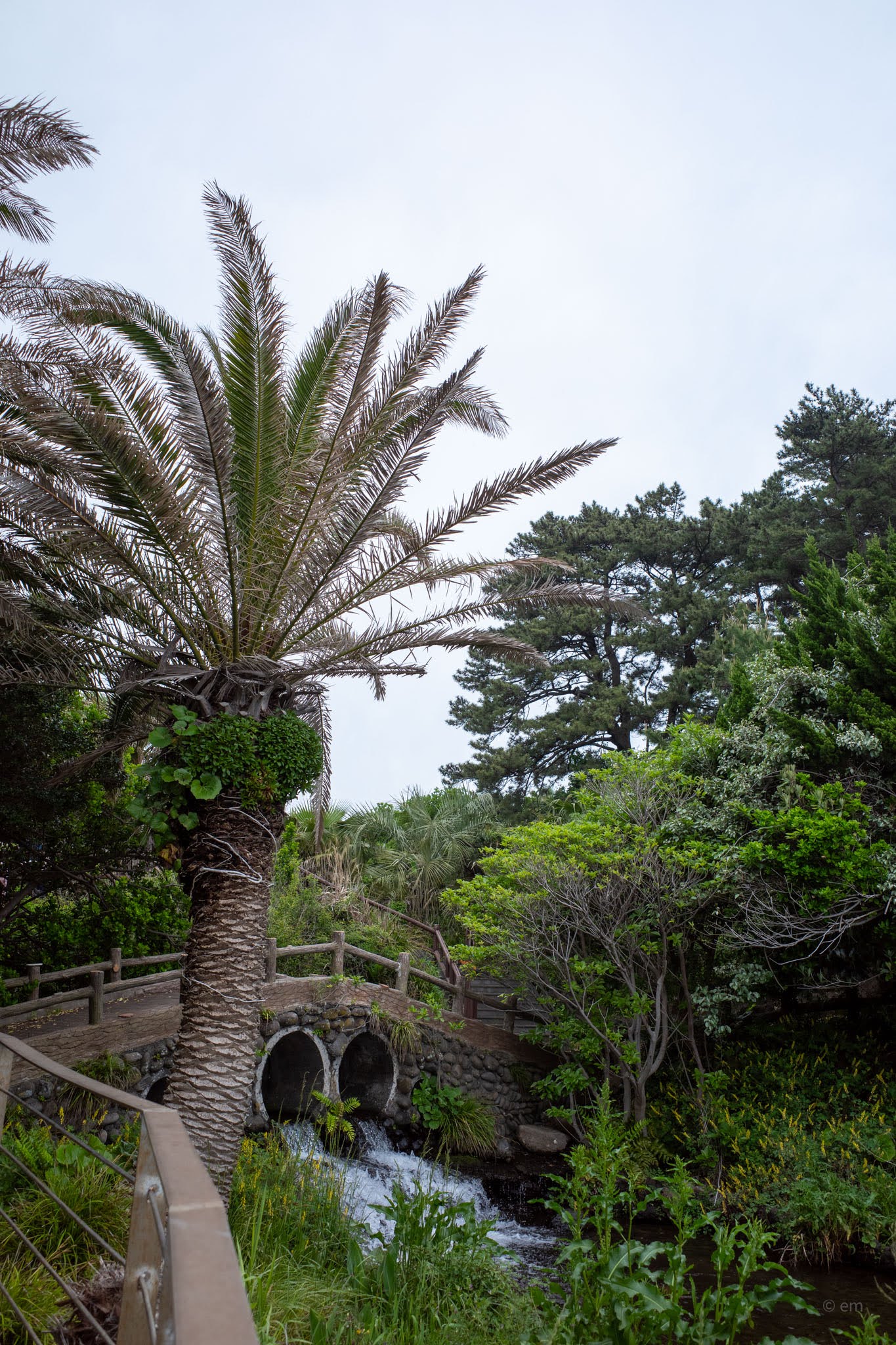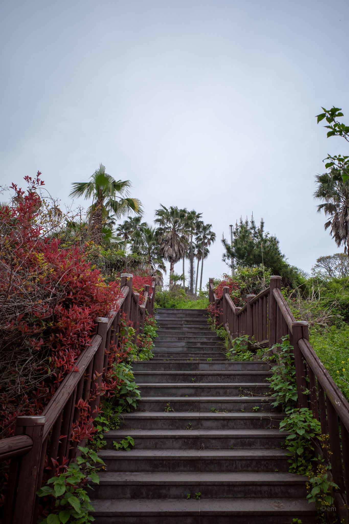 The path down from the castle to the water is worth taking slowly. A wooden boardwalk descends through subtropical greenery — fan palms, cycads, fig, and wild grasses tumbling toward the cliff edge — to a basalt boulder beach where the columns of Jeju’s volcanic shoreline meet the water in layers. Looking back up from the rocks, the scale of the cliff and the improbability of the building’s position above it becomes fully apparent.